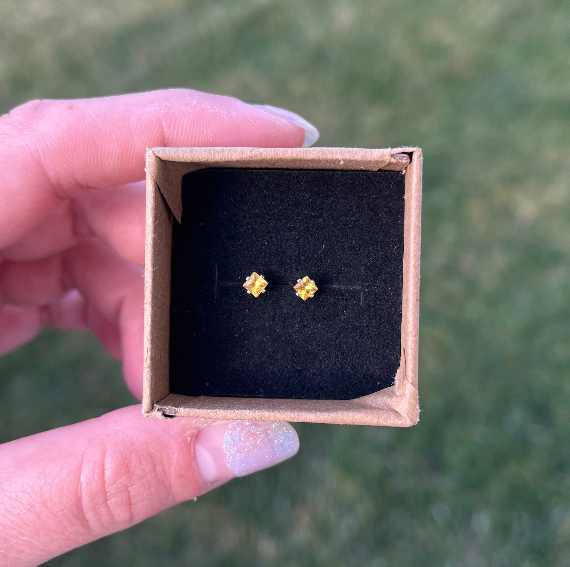 4 mm square citrine gemstones prong set on sterling silver posts.
