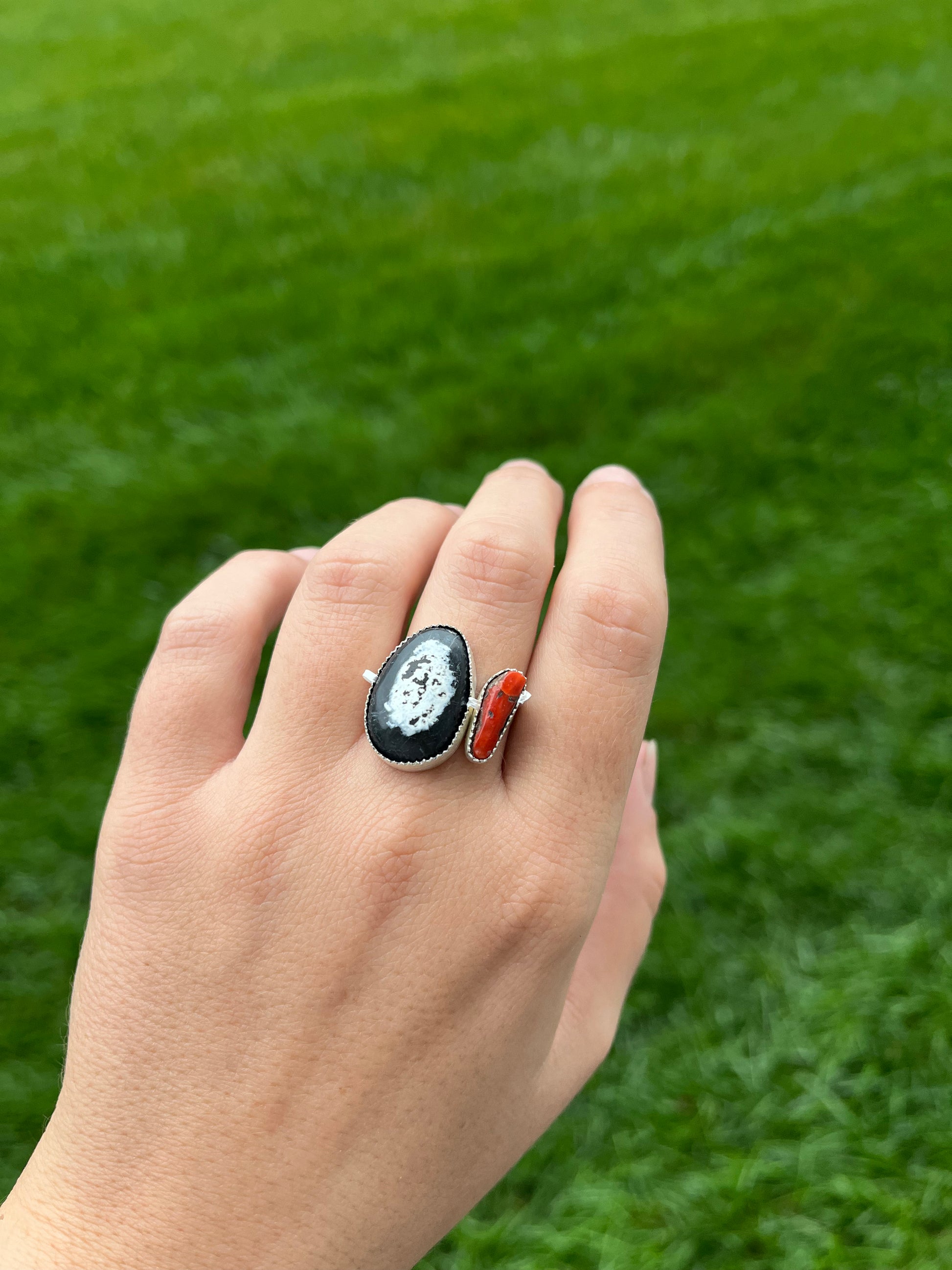 White buffalo and orange spiny oyster set in sterling silver on an open adjustable sterling silver ring band finished in your size. The ring will be adjustable up to 1 size bigger or smaller from the size ordered. See sketch for reference. Please allow 1-2 weeks for your ring to be completed in your size and to be shipped.